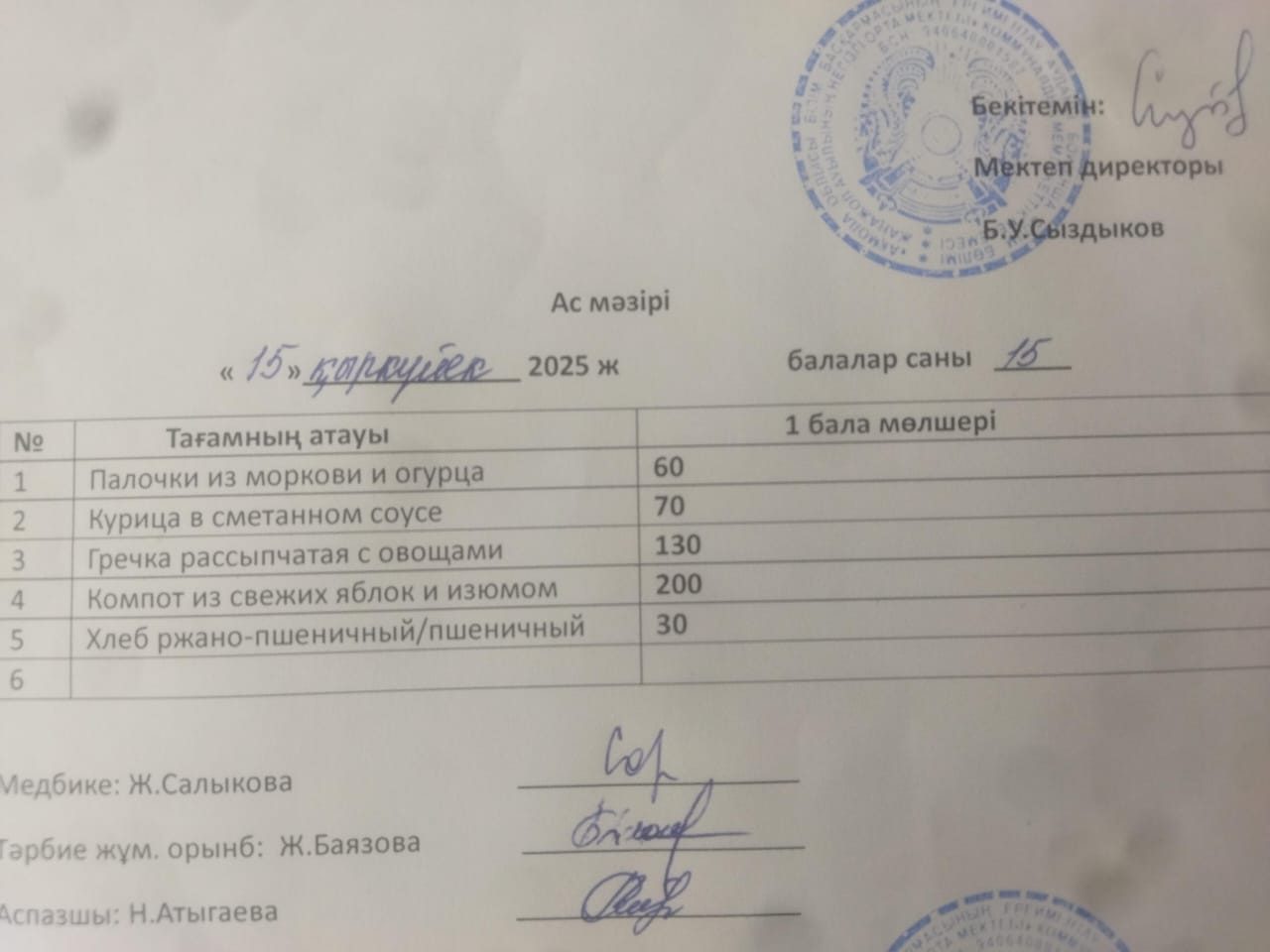 Ас мәзірі 15.09.2025ж